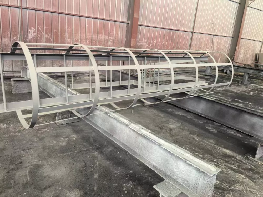 గార్డ్రైల్ ఇన్స్టాలేషన్: 3 మీటర్ల ఎత్తుకు మించిన మెట్ల కోసం, తప్పనిసరిగా భూమికి 2.5 మీటర్ల ఎత్తులో గార్డ్రైల్లను ఏర్పాటు చేయాలి. గార్డ్రైల్ వ్యాసం 700 mm మరియు 800 mm మధ్య ఉండాలి. క్షితిజసమాంతర వలయాలు 300 mm నుండి 450 mm వలయాల మధ్య దూరంతో 16 mm రౌండ్ స్టీల్తో తయారు చేయాలి. వర్టికల్ రీన్ఫోర్స్మెంట్ బార్లను తప్పనిసరిగా 12 మిమీ రౌండ్ స్టీల్తో తయారు చేయాలి, కనీసం నాలుగు బార్లు ఏకరీతిలో ఉండాలి. భద్రతా పంజరం తప్పనిసరిగా నిచ్చెన లేదా విశ్రాంతి ప్లాట్ఫారమ్ యొక్క పైభాగానికి నిరంతరం వ్యవస్థాపించబడాలి. కనెక్టర్లు మరియు ఫిక్సింగ్లు
